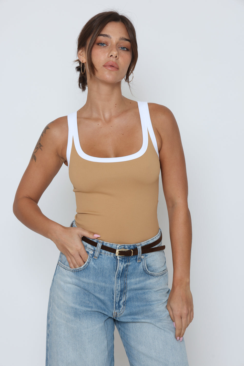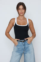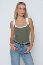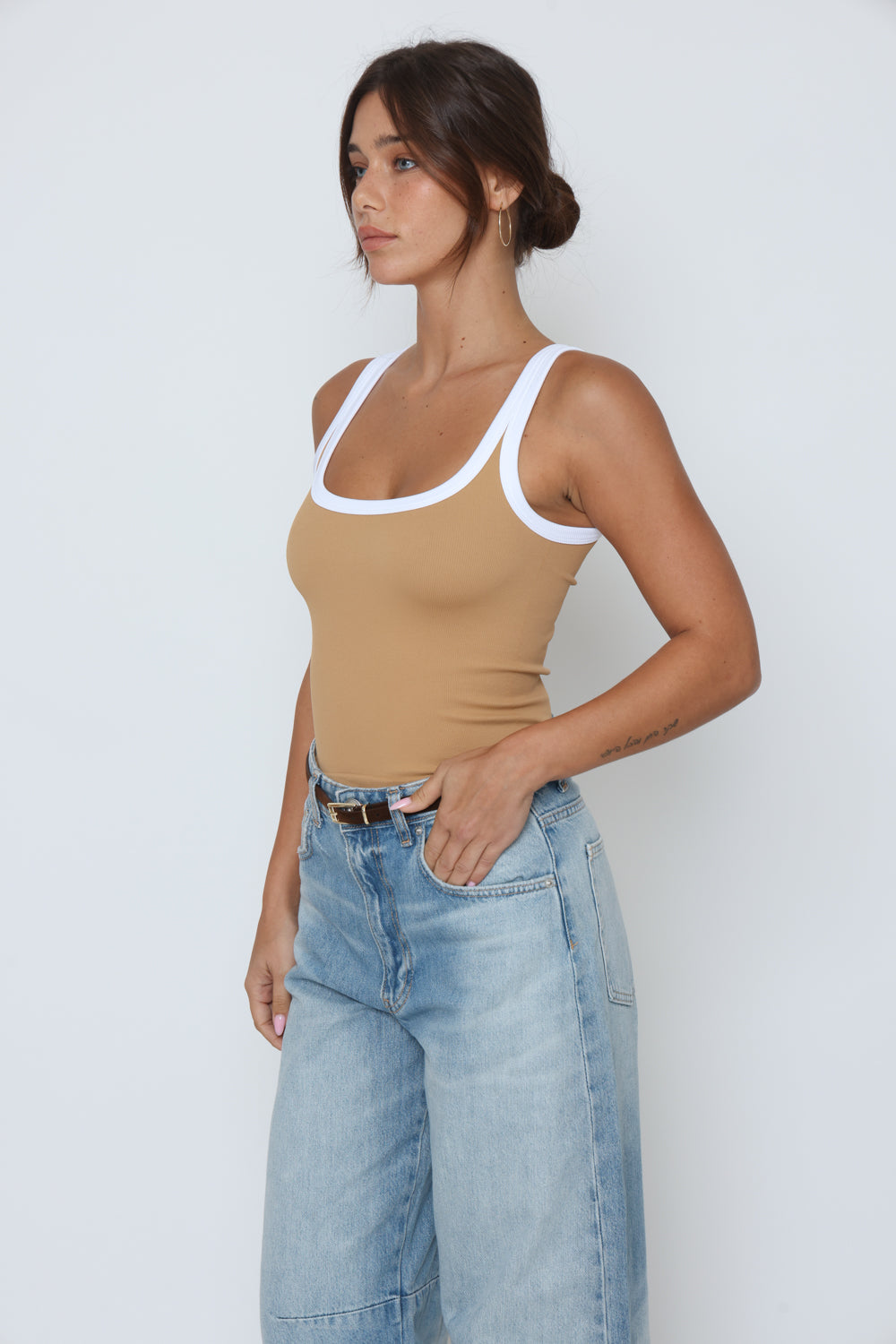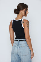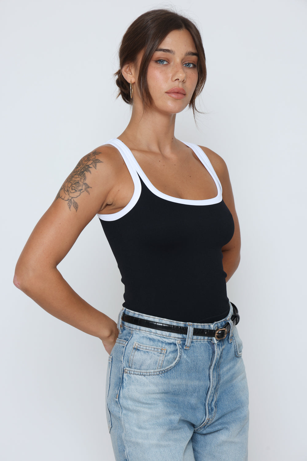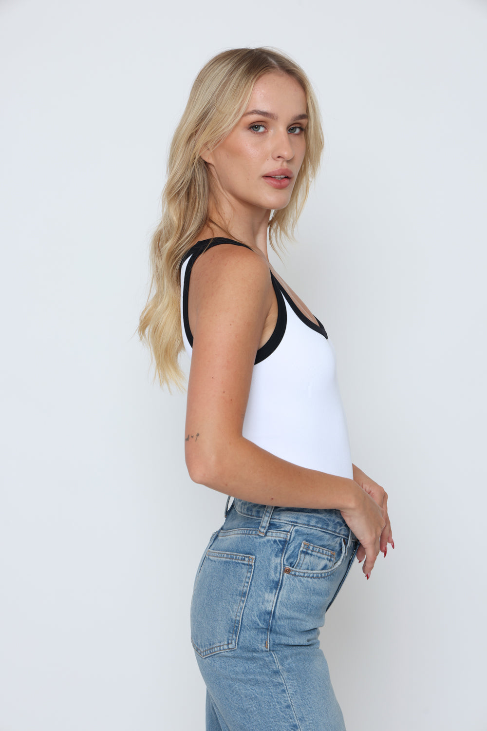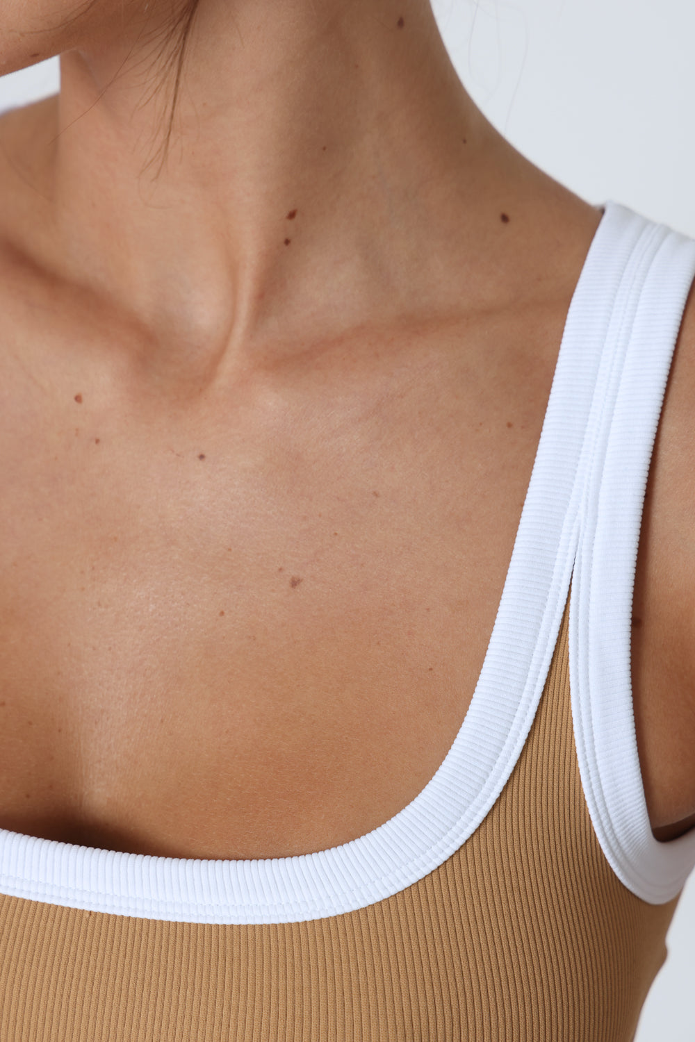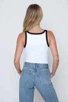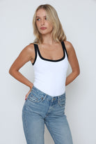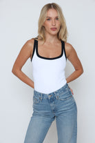 גופיה פס לבן גב סגור עשוי מלייקרה איכותית עם מתיחה עדינה שמעניקה נוחות וגזרה מחמיאה.