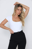 בגד גוף בד דאבל פתח מרובע שרוול קצר עשוי מלייקרה יוקרתית עם מתיחה אלסטית לנוחות בלתי מתפשרת ומראה אלגנטי.