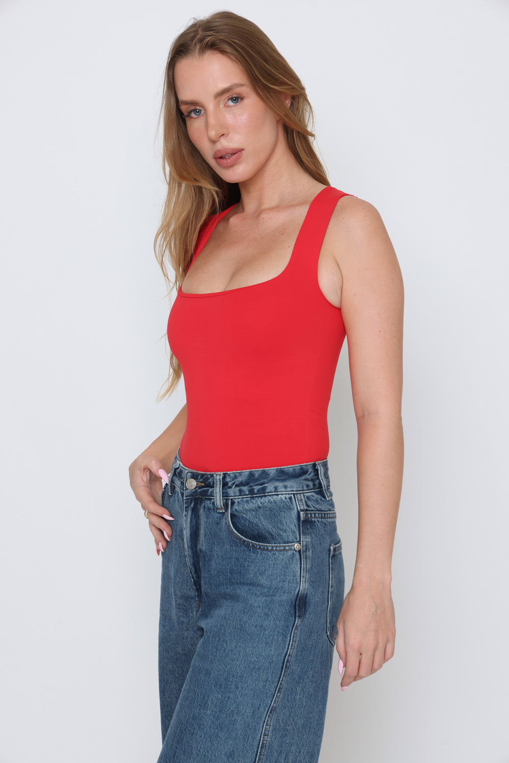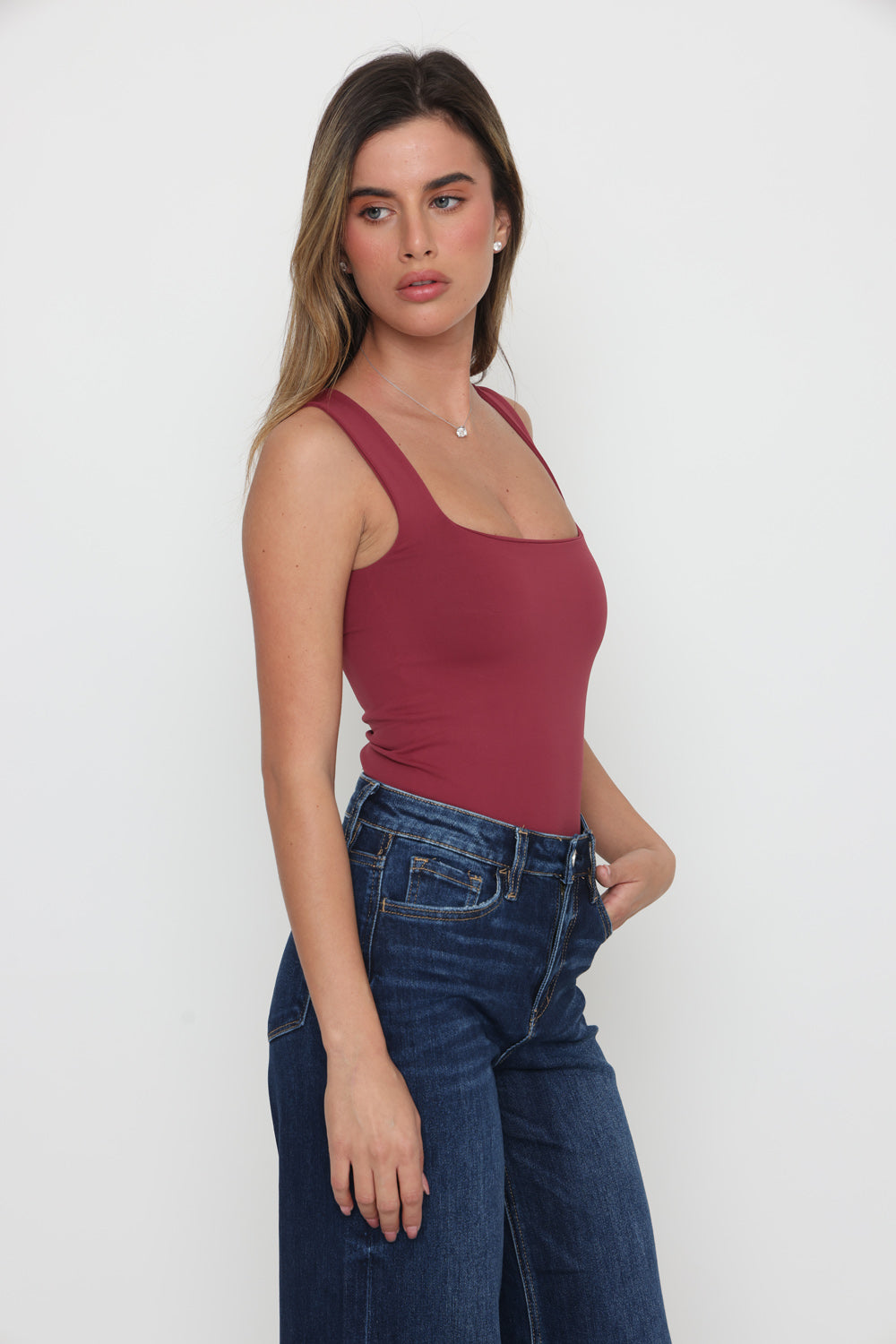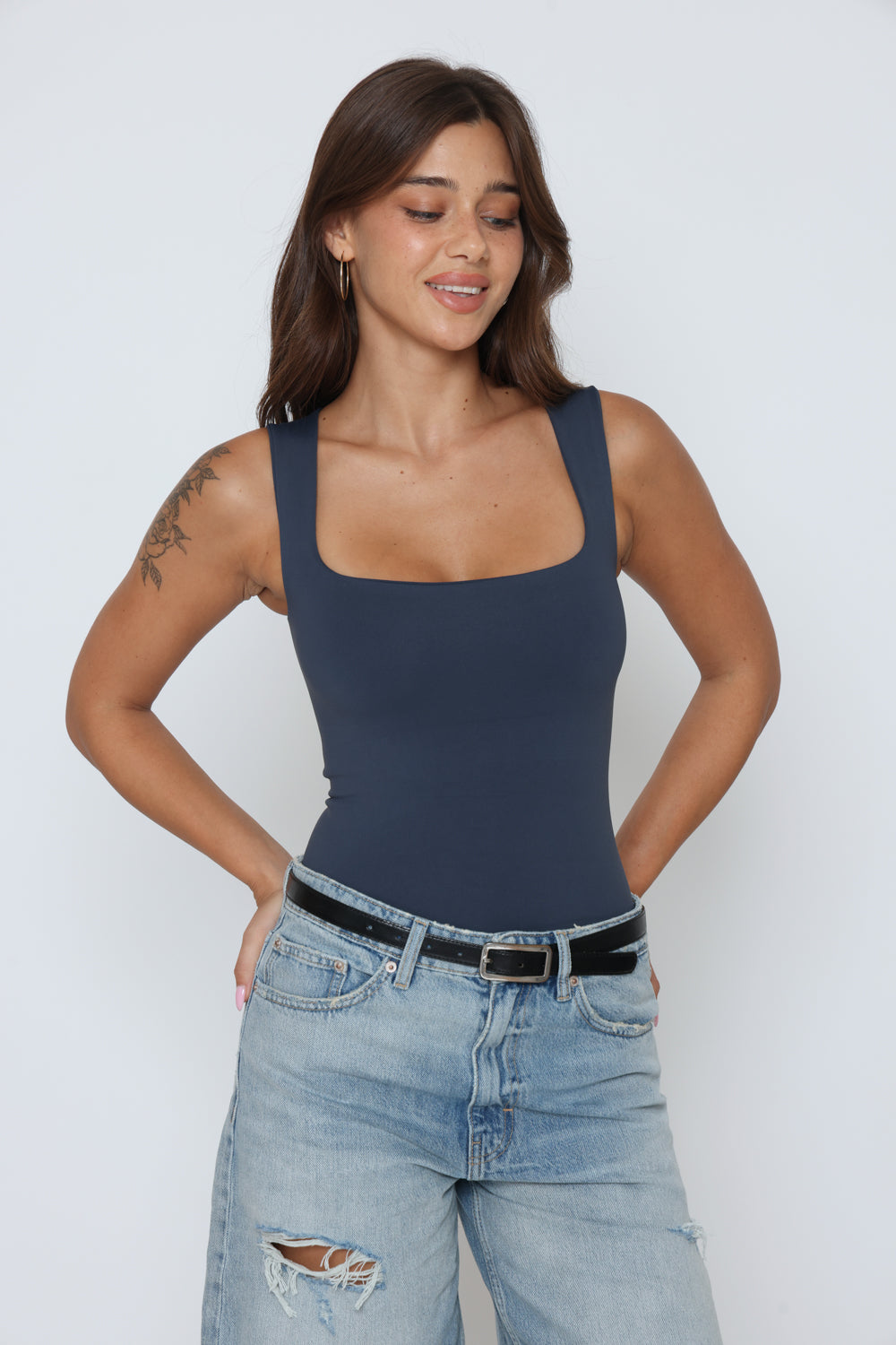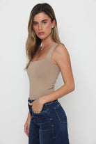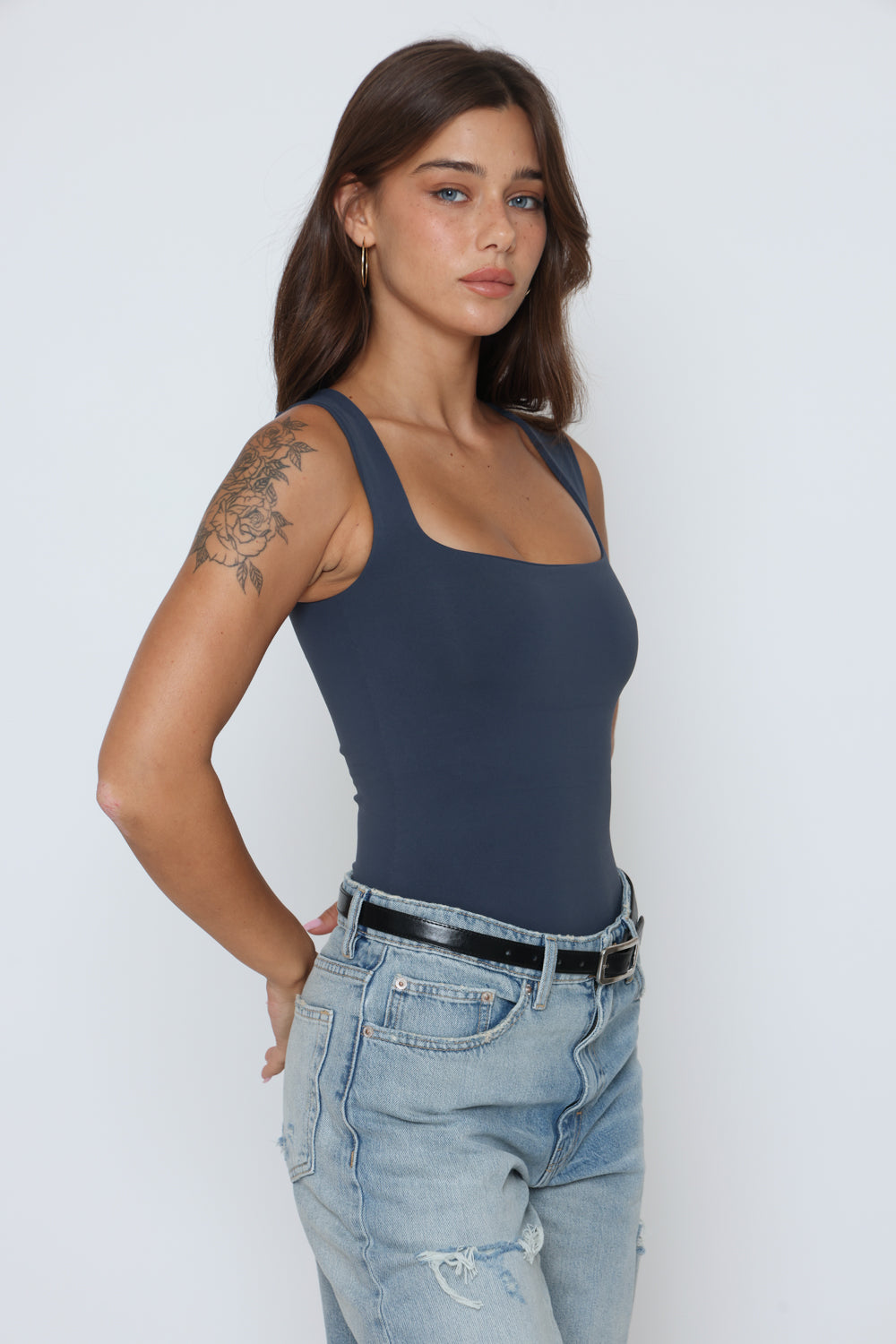 בגד גוף פתח מרובע בד כפול בד לייקרה איכותי במרקם רך וגמיש, מעניק תחושה יוקרתית ונוחות מרבית.