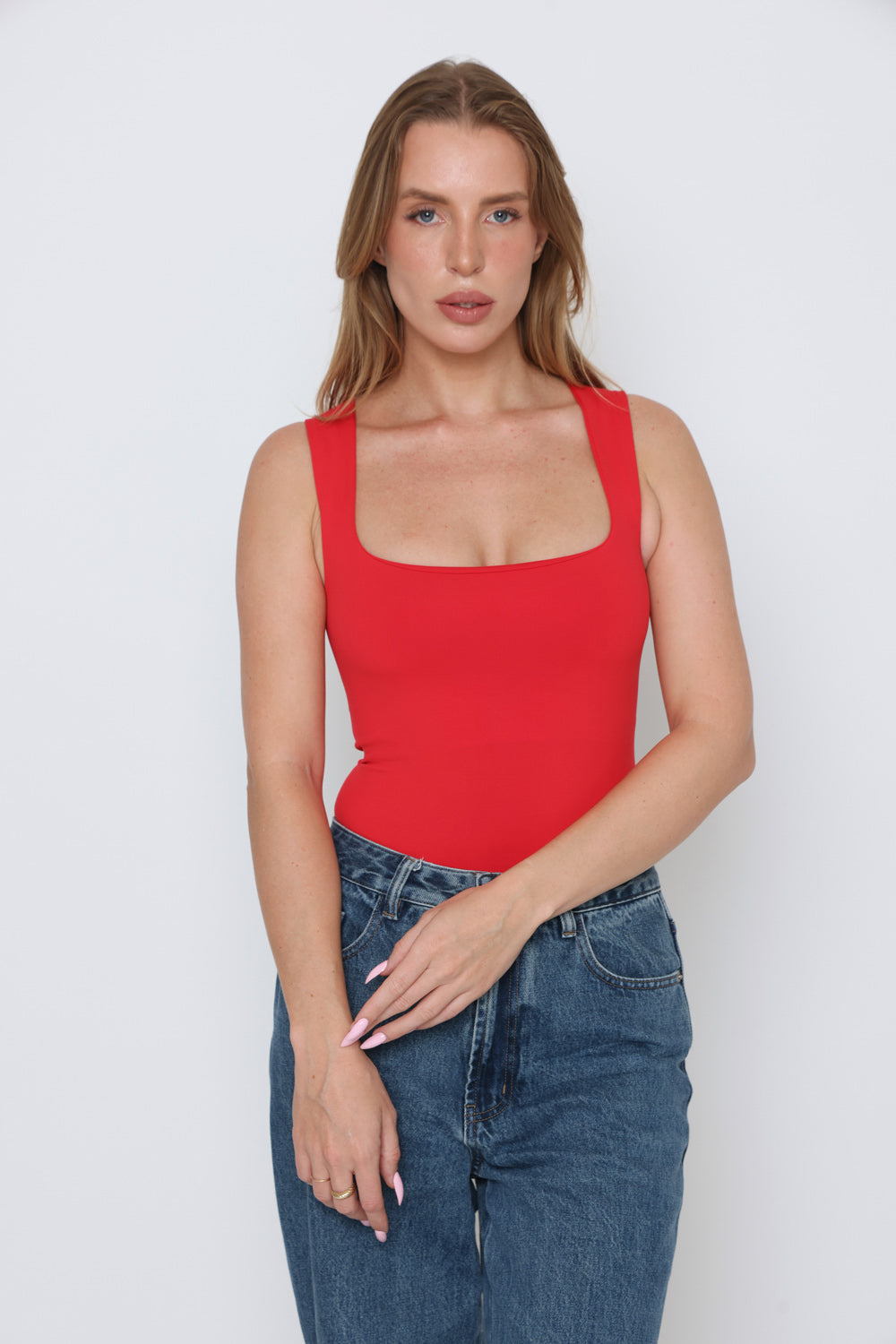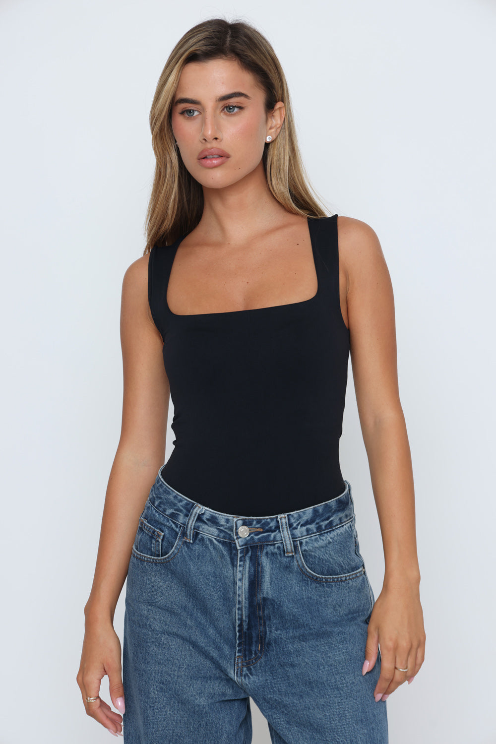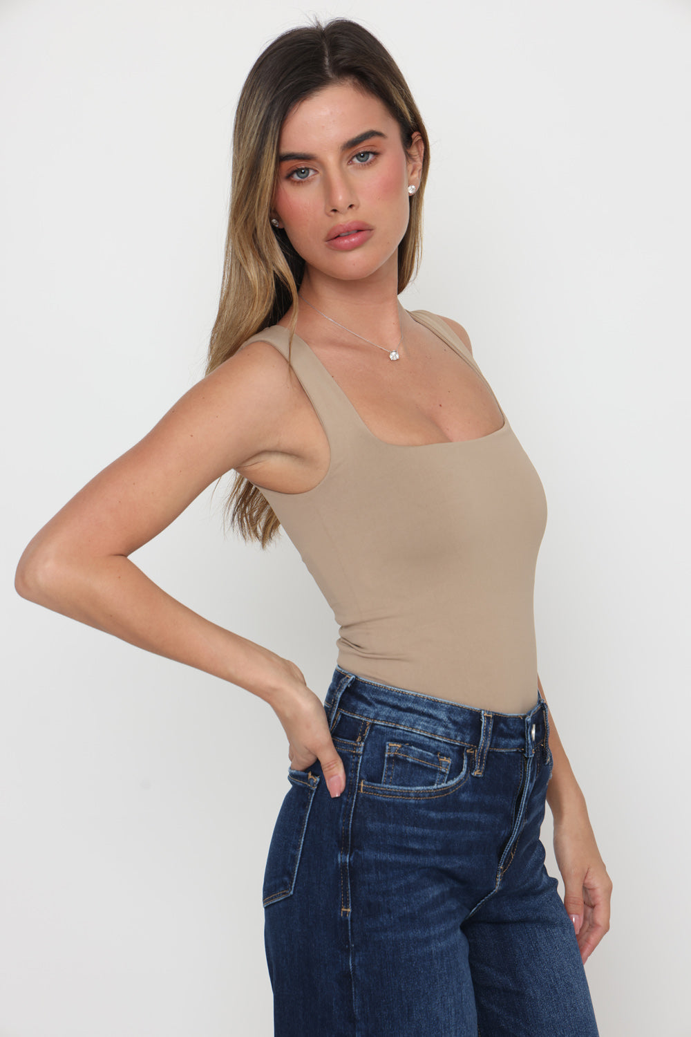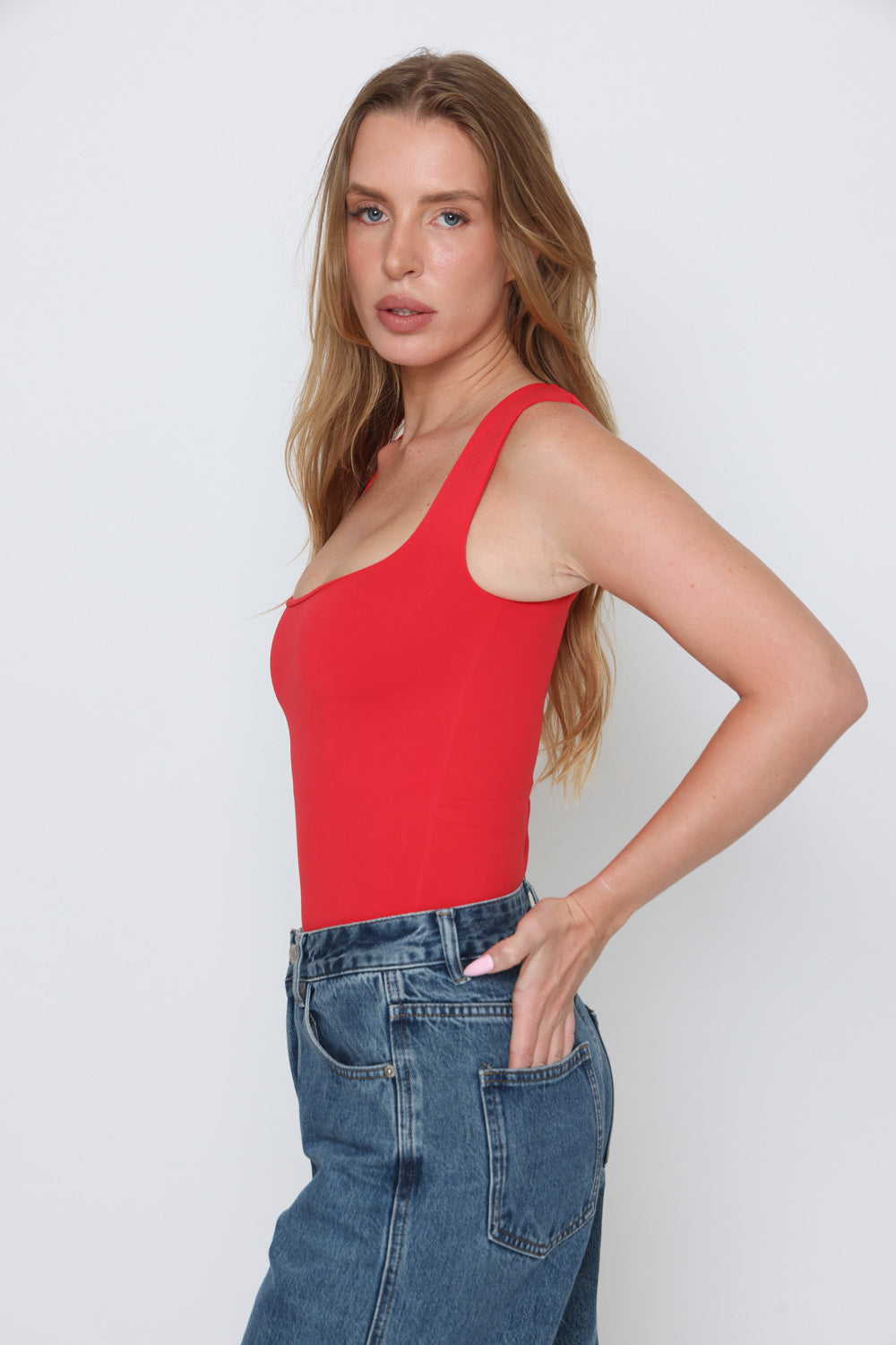 בגד גוף פתח מרובע בד כפול בד לייקרה איכותי במרקם רך וגמיש, מעניק תחושה יוקרתית ונוחות מרבית.