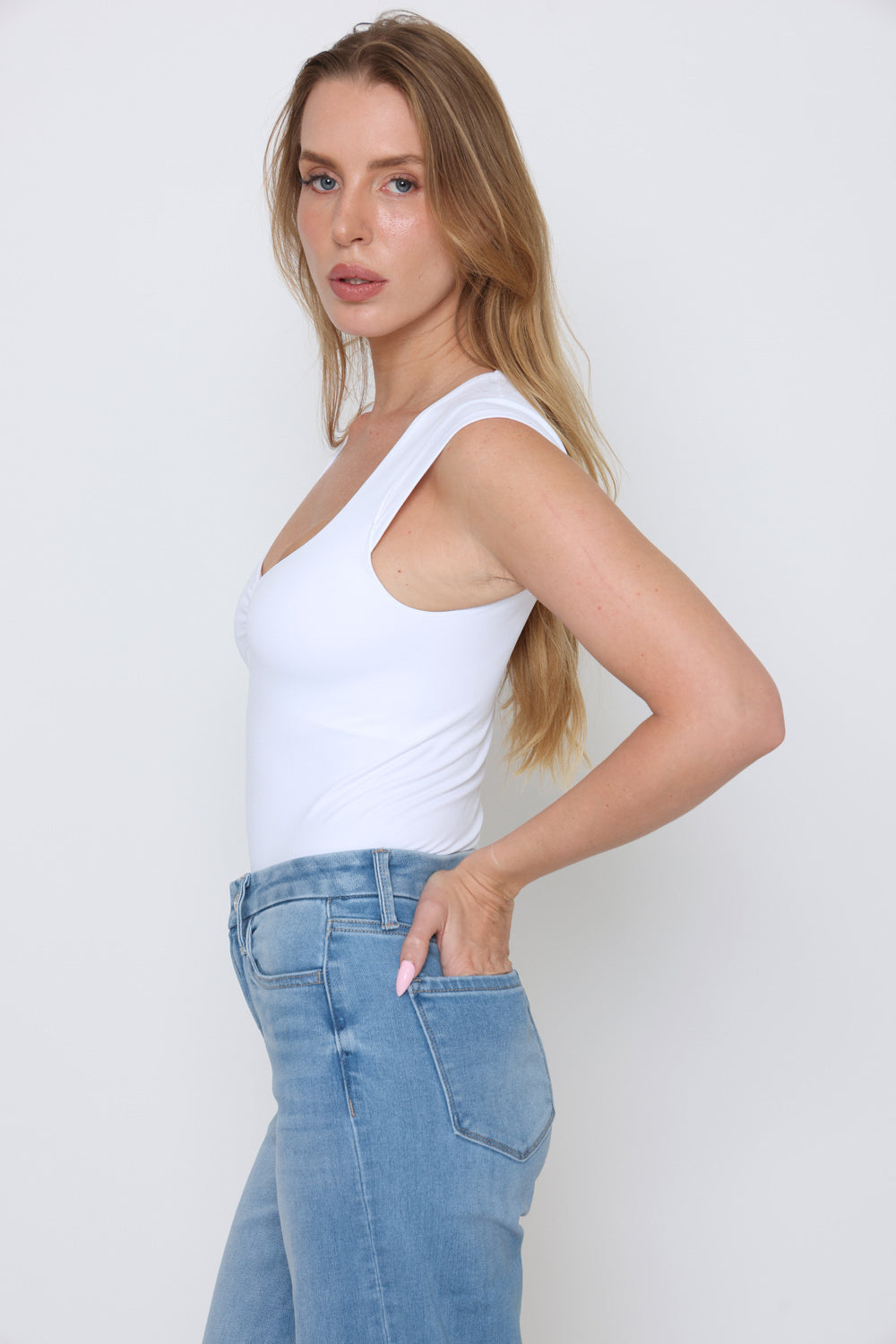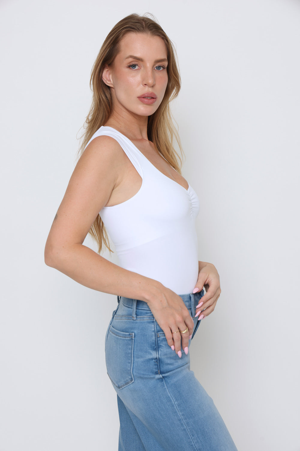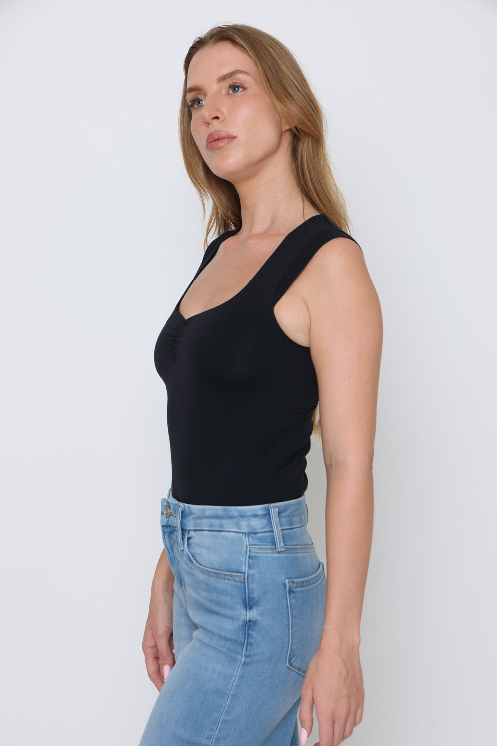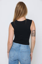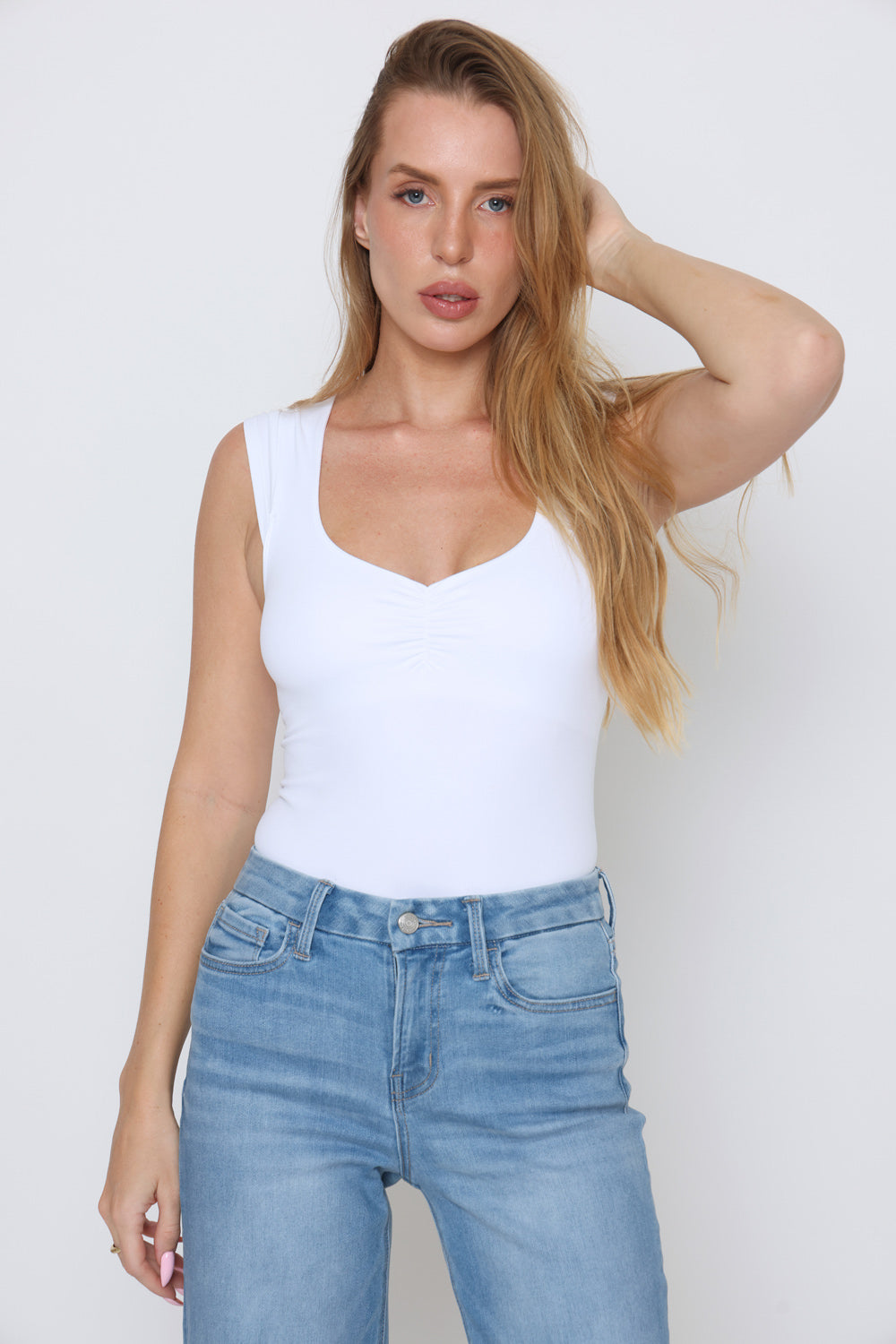גופיה שרוול קטן + כיווץ מקדימה עשוי מלייקרה יוקרתית עם מתיחה אלסטית לנוחות בלתי מתפשרת ומראה אלגנטי.
